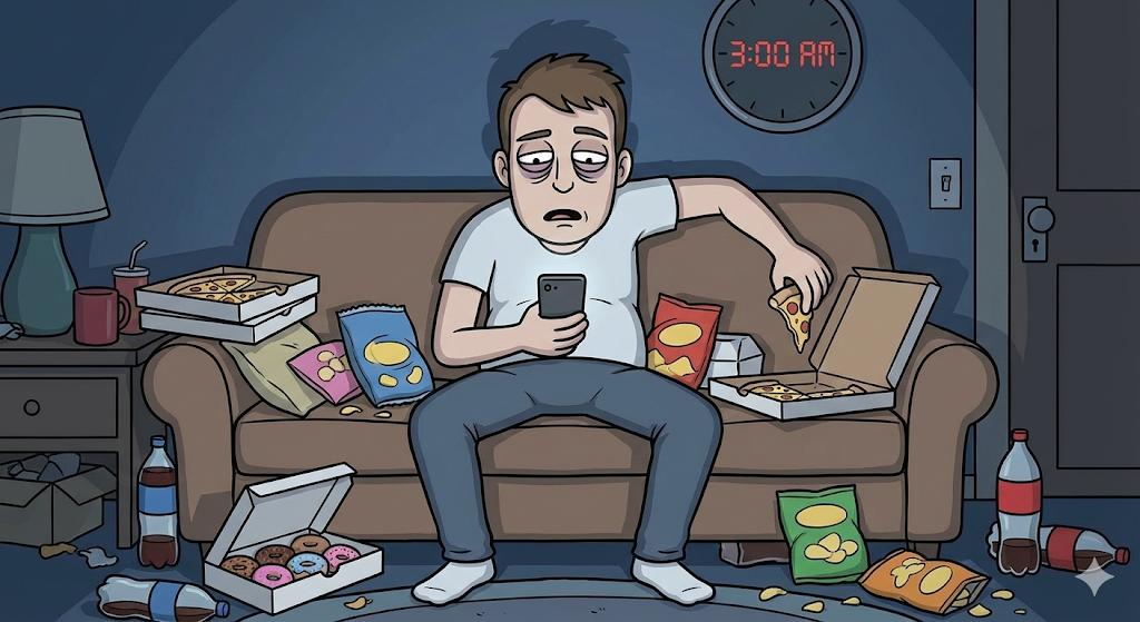 現実逃避で食べて飲んで、結果的に体がボロボロになるループ。